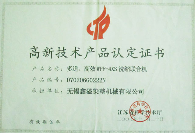 新型四通道洗縮聯合機(WPF-4XS洗縮聯合機),獲得國家頒發的“高新技術產品”證書